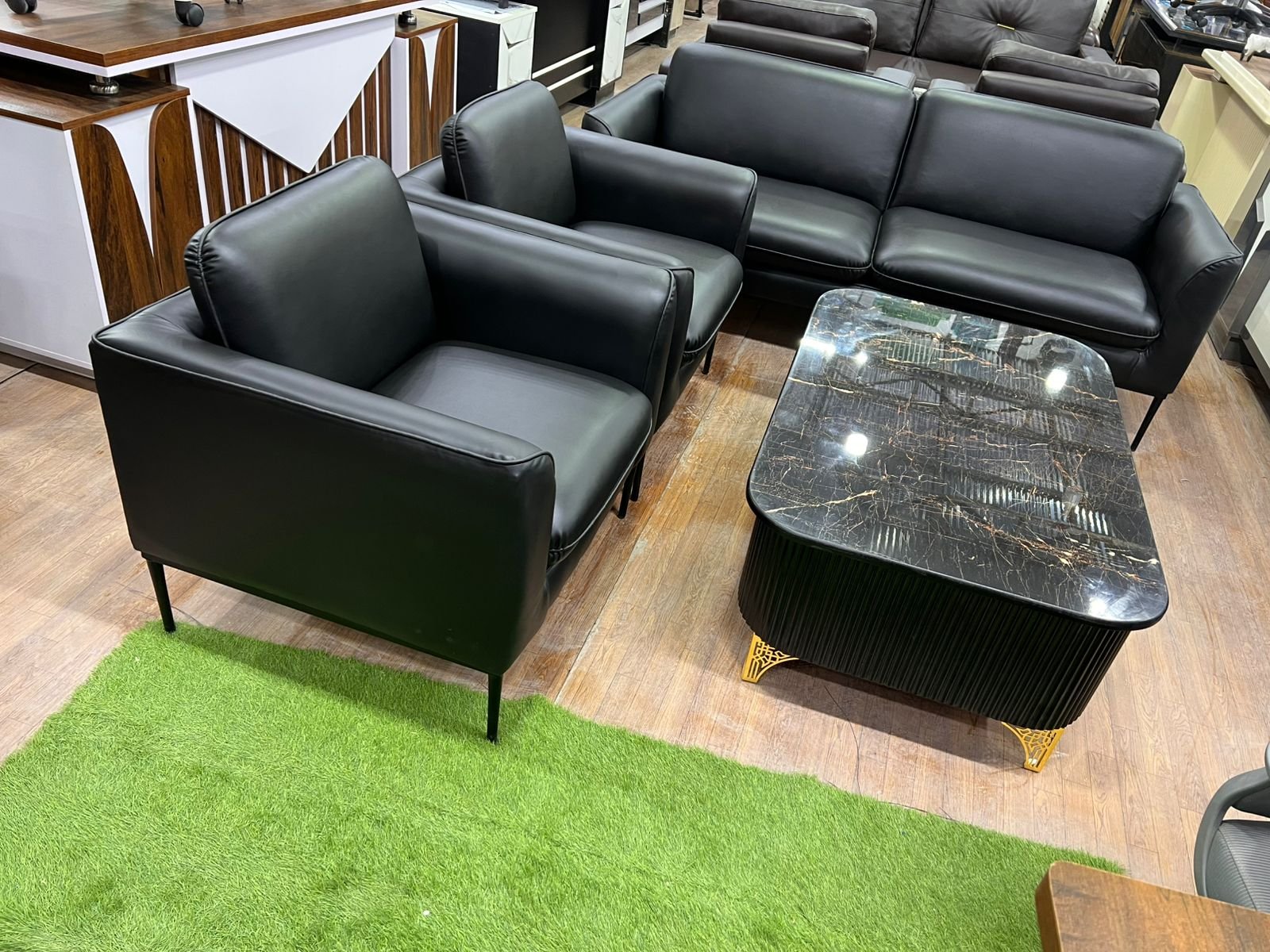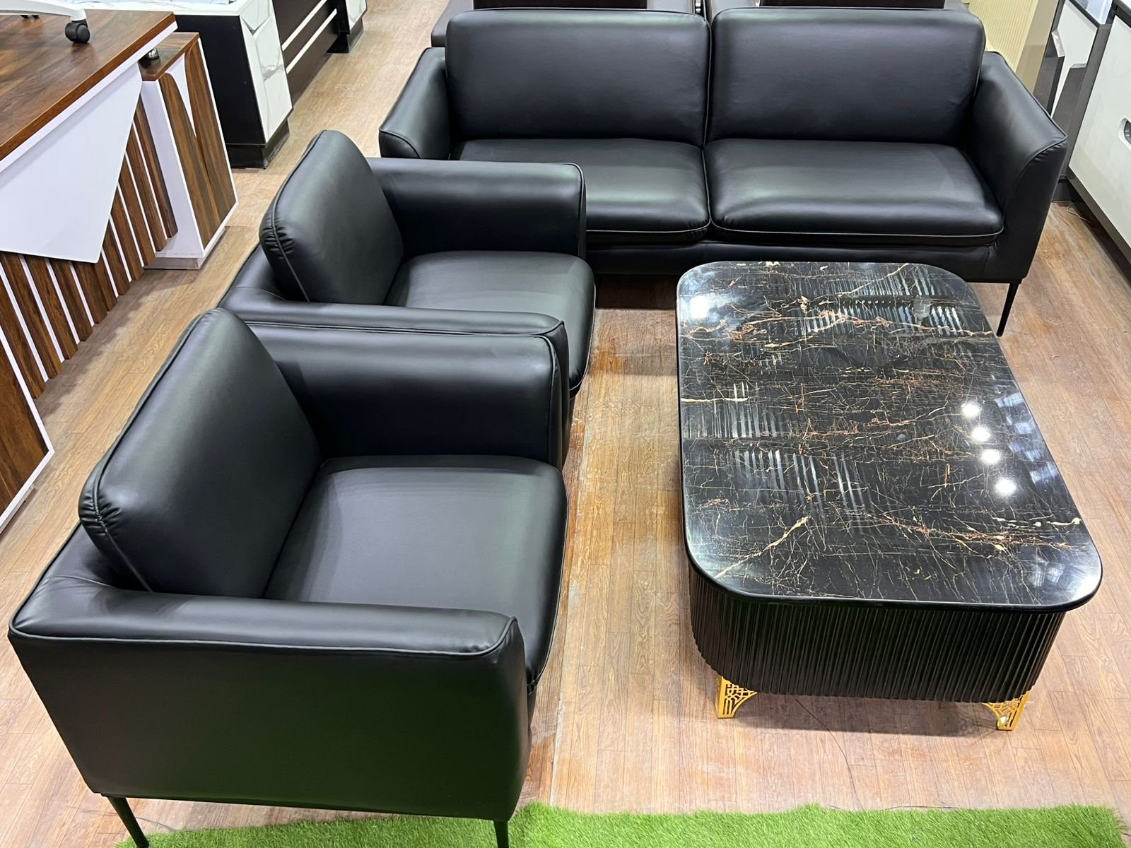 Ye black leather sofa set 3+1+1 style mein hai, jismein ek 3-seater sofa aur do single armchairs hain, aur marble top coffee table gold legs ke saath.